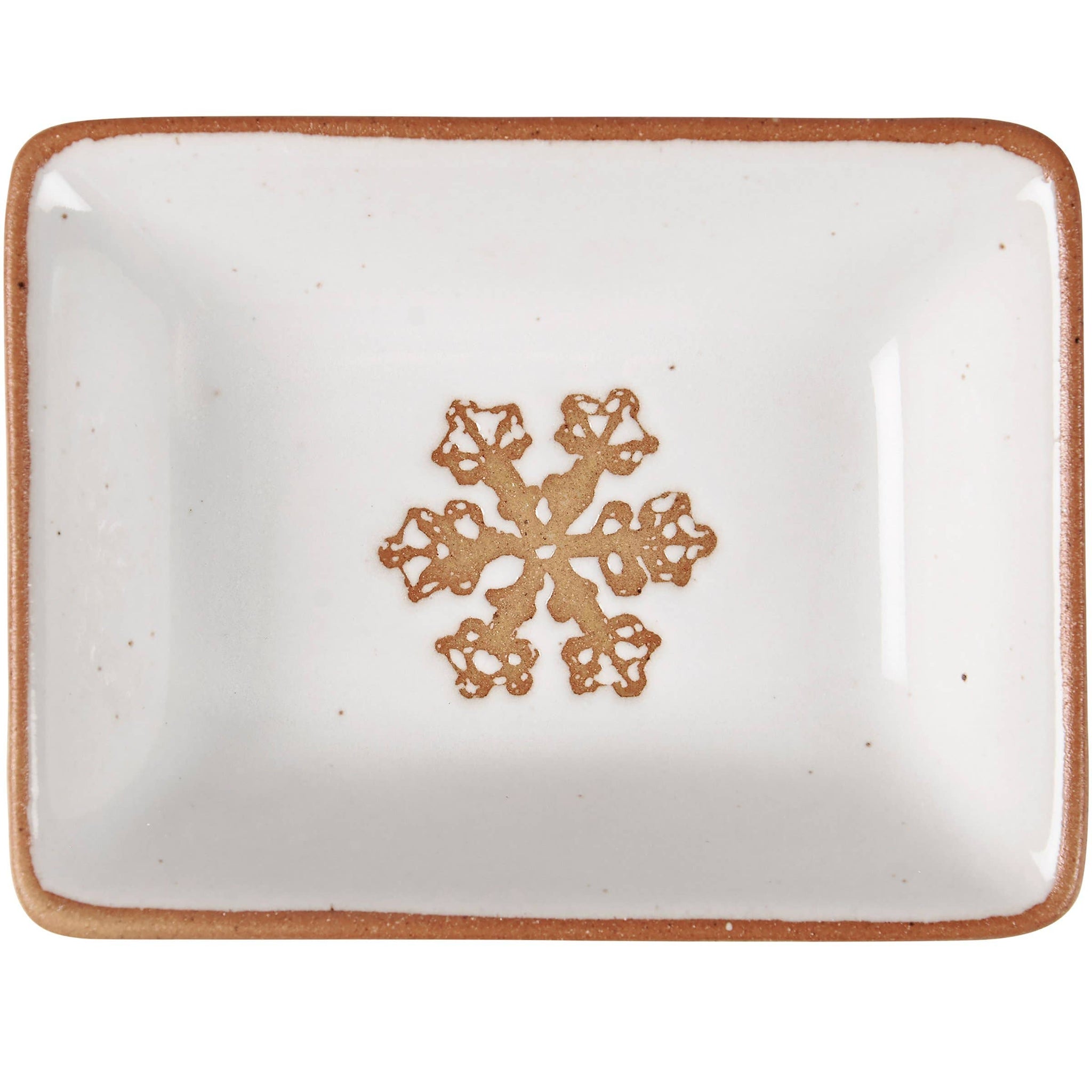 A durable stoneware tray from our Christmas Collection displaying a snowy cream color with debossed snowflake in brown color on the inside and bare ceramic accents on the rim. Our Snowflake mini tray is microwave, dishwasher, and food safe for convenient use. A piece of rustic tableware perfect for seasonal gatherings.