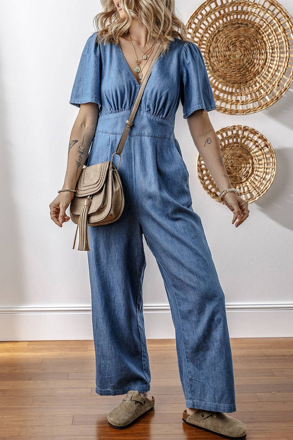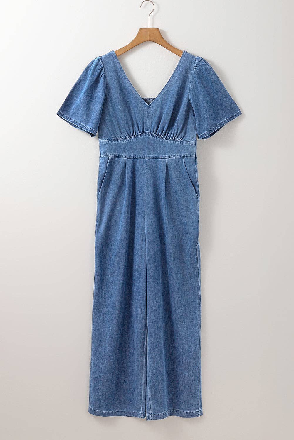 Riley Denim V-Neck Short Sleeve Jumpsuit
