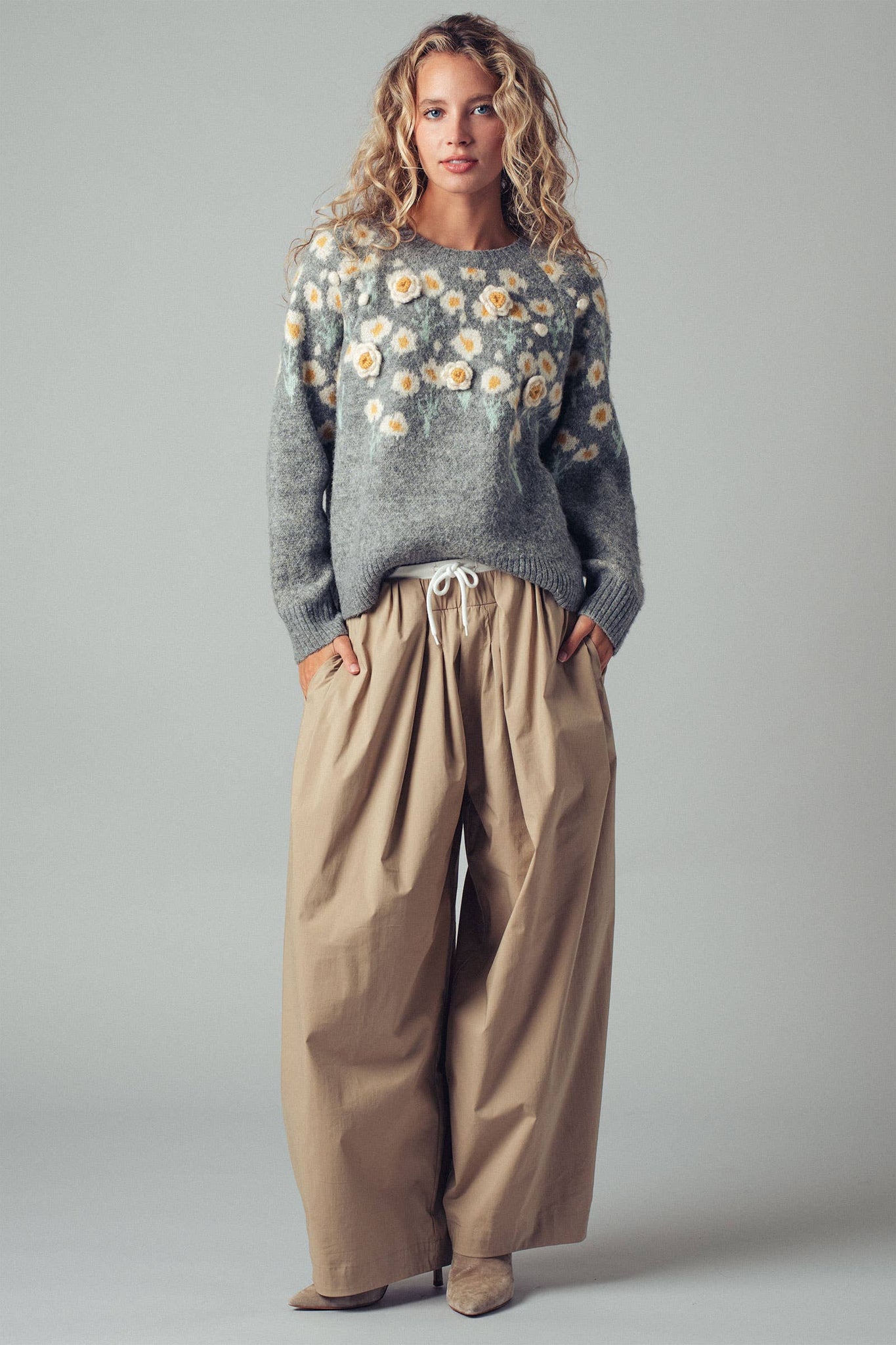 Bring soft charm to chilly days with this daisy-embroidered knit sweater featuring delicate 3D floral detailing and pastel accents. Cozy, stretchy, and layer-friendly—it's a perfect touch of whimsy for your fall-to-winter wardrobe. Features • 74% Acrylic, 22% Polyester, 4% Lycra • 3D floral knit detailing • Soft brushed texture • Ribbed hem, neck, and cuffs • Fit: Classic fit with gentle stretch